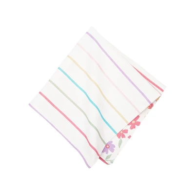 The Bunnies & Blooms printed table linen collection features a charming all-over pattern of simplistic flowers, including daffodils, daisies, and other delightful spring blooms. With a perfect springtime color palette featuring shades of pink, blue, purple, yellow, and green, these table linens offer a refreshing touch to any setting. For added versatility, reverse them to reveal a simple stripe pattern in coordinating colors, providing endless styling possibilities.