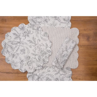 Featuring whimsical songbirds and other natural motifs in a soothing grey and white color palette, the Callahan Songbirds table linen collection is a charming way to style any tablescape, including the matching reversible napkin. The delightful floral and damask-style pattern reverses to a simple stripe pattern in coordinating colors for more styling options. Love this look? Callahan Songbirds is also available as a bedding collection.