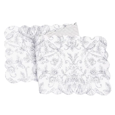 Featuring whimsical songbirds and other natural motifs in a soothing grey and white color palette, the Callahan Songbirds table linen collection is a charming way to style any tablescape, including the matching reversible napkin. The delightful floral and damask-style pattern reverses to a simple stripe pattern in coordinating colors for more styling options. Love this look? Callahan Songbirds is also available as a bedding collection.