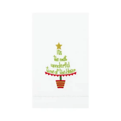 Festive embroidered cotton guest towel featuring a Christmas tree and cheerful phrase. Perfect for bathrooms, kitchens, or as a decorative accent. Durable, stylish, and practical, it also makes a thoughtful holiday gift for family, friends, or hosts.