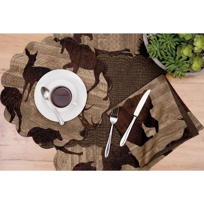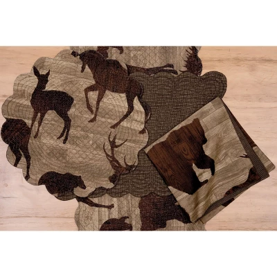 - This rustic quilted tabletop collection brings the outdoors to your home with a random pattern of wildlife including bear, deer and moose silhouettes in tonal shades of brown on a distressed wood-inspired ground.
