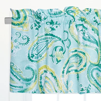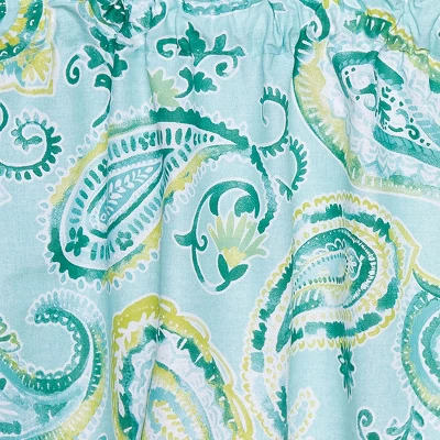 The Jade ruffled valance brightens your home with a fresh and colorful design. Displaying a large-scale paisley design in green and chartreuse motifs with floral accents on an enlivening light turquoise base. Jade brings a breath of fresh air to your breakfast nook, kitchen bar or dining room, creating an welcoming scene for any day of the year. This ruffled unlined valance is light filtering with a 2-inch rod pocket and a 1-inch decorative header. Crafted of cotton, machine wash and tumble dry low for easy care. Love this pattern? Jade is also available in our bedding and tabletop collections. Each valance is 72″ wide, hanging rod not included.