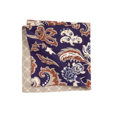 - A classic regent design composed of paprika, gray, white and blues on a robust navy blue ground