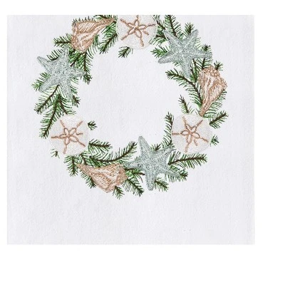 Made from soft flour sack fabric, the Shell Christmas Wreath Kitchen Towel features an embroidered wreath adorned with tan and light blue seashells, starfish, and delicate white sand dollars, all nestled within a green pine tree wreath. Perfect for adding a seaside twist to Christmas celebrations, this towel is both functional and decorative, making it an ideal accent for any seasonal kitchen setup. Enjoy the blend of festive cheer and coastal elegance with this unique holiday piece.