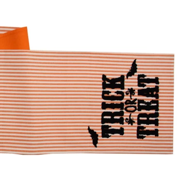 - This festive table runner features charming “Trick or Treat” text with playful bats on one side and classic stripes on the reverse, offering two stylish looks in one piece for your dining table during the fall and Halloween season.