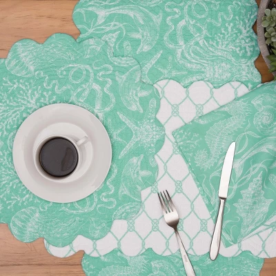 Bring the ocean to you – no matter where you are – with Turquoise Bay tabletop collection. Featuring a graceful marine pattern on vibrant seafoam green, the Turquoise Bay collection is perfect for a modern beach look, a sophisticated coastal dining room, or a relaxing vacation spot breakfast nook. Turquoise Bay reverses to a coordinating net and double Carrick bend knot design for even more coastal or nautical styling options. Finished with a scalloped edge, this tabletop collection is crafted of 100% cotton and hand guided machine quilting. Stains and spills are no problem, machine wash cold and tumble dry low for easy care. Love this pattern? The Turquoise Bay collection is also available in a bedding collection.