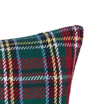 Plaid tidings to all with the rich jewel tones of Weston Plaid collection. Festive hues of red, green, white, yellow and blue are woven into a traditional plaid, bringing cheerful coziness to your home. This pillow’s timeless red and green plaid is perfect to coordinate with your traditional Christmas decor or to accent your rustic holiday lodge style. Accent pillows add both comfort and artful appeal to any area of your home, toss this one on your couch or pair with your favorite quilt for a bedroom makeover. Finished with a clean knife edge this pillow has a zipper closure that secures the removable polyester insert. Size: 18 x 18 inches. Spot cleaning recommended.